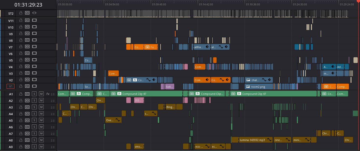Full Timeline (Orange for fusion effect, Brown for Music pist, Pink for interview, Blue for footage and picture, and Green for sound and Audio)